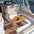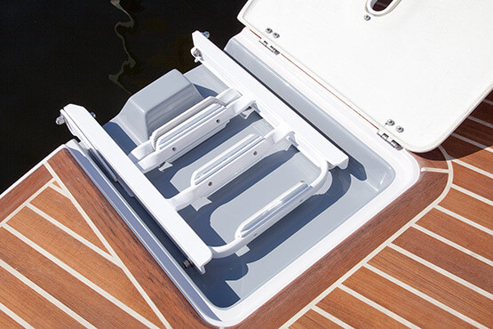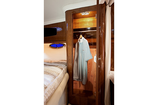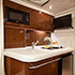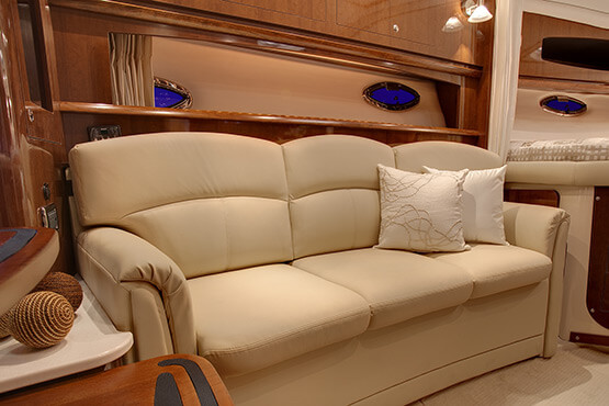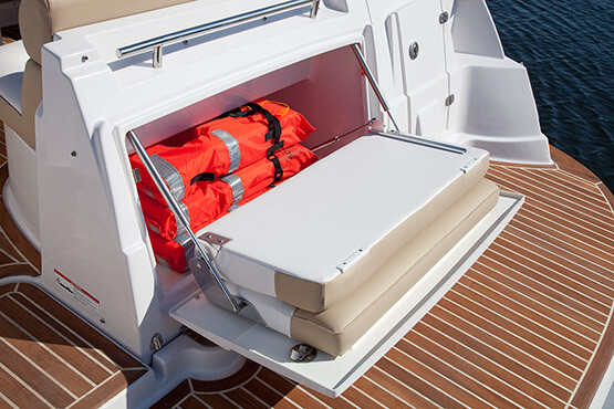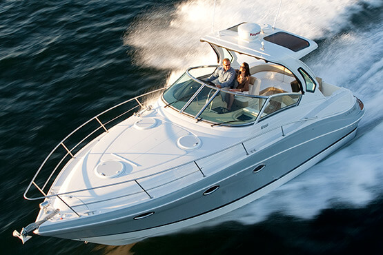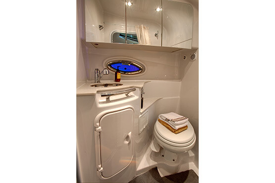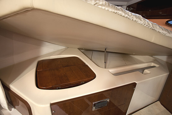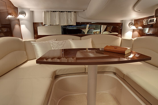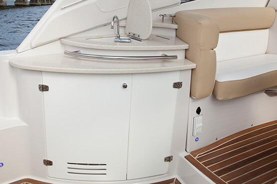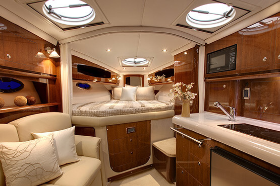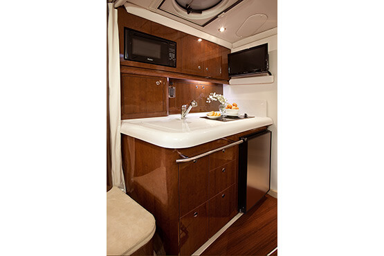 You'll be captivated by the Vista 335 cruiser. It's a 33-foot vision of understated elegance, from the smartly-designed cabin accommodations flanked by rich wood cabinetry to the well-appointed galley. Consider an optional private stateroom with flat-screen TV.